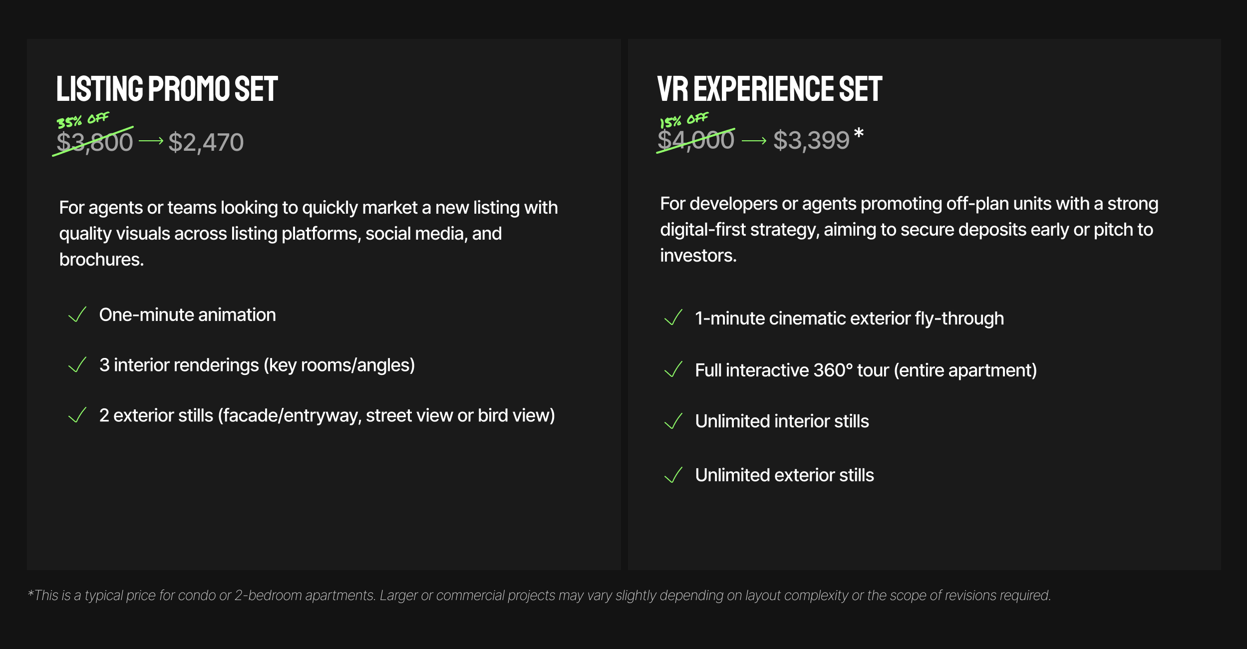 At Housescape, we just rolled out bundled packages built for scale. Our 3D architectural rendering studio often handles big projects with tons of deliverables—multiple interior/exterior stills, 3D floor plans, presentations, even animations. Overcharging isn’t our style; we’d rather earn loyalty. Bundles make the budget predictable, reward volume, and keep approvals simple.